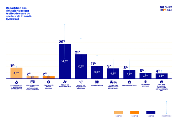 En 2023, le Shift Project a estimé les émissions de gaz à effet de serre du secteur de la Santé en France a 49 millions de tonnes de CO2 en moyenne, soit près de 8% des émissions du pays. 50% de ces émissions sont issues des achats de dispositifs médicaux et de médicaments.