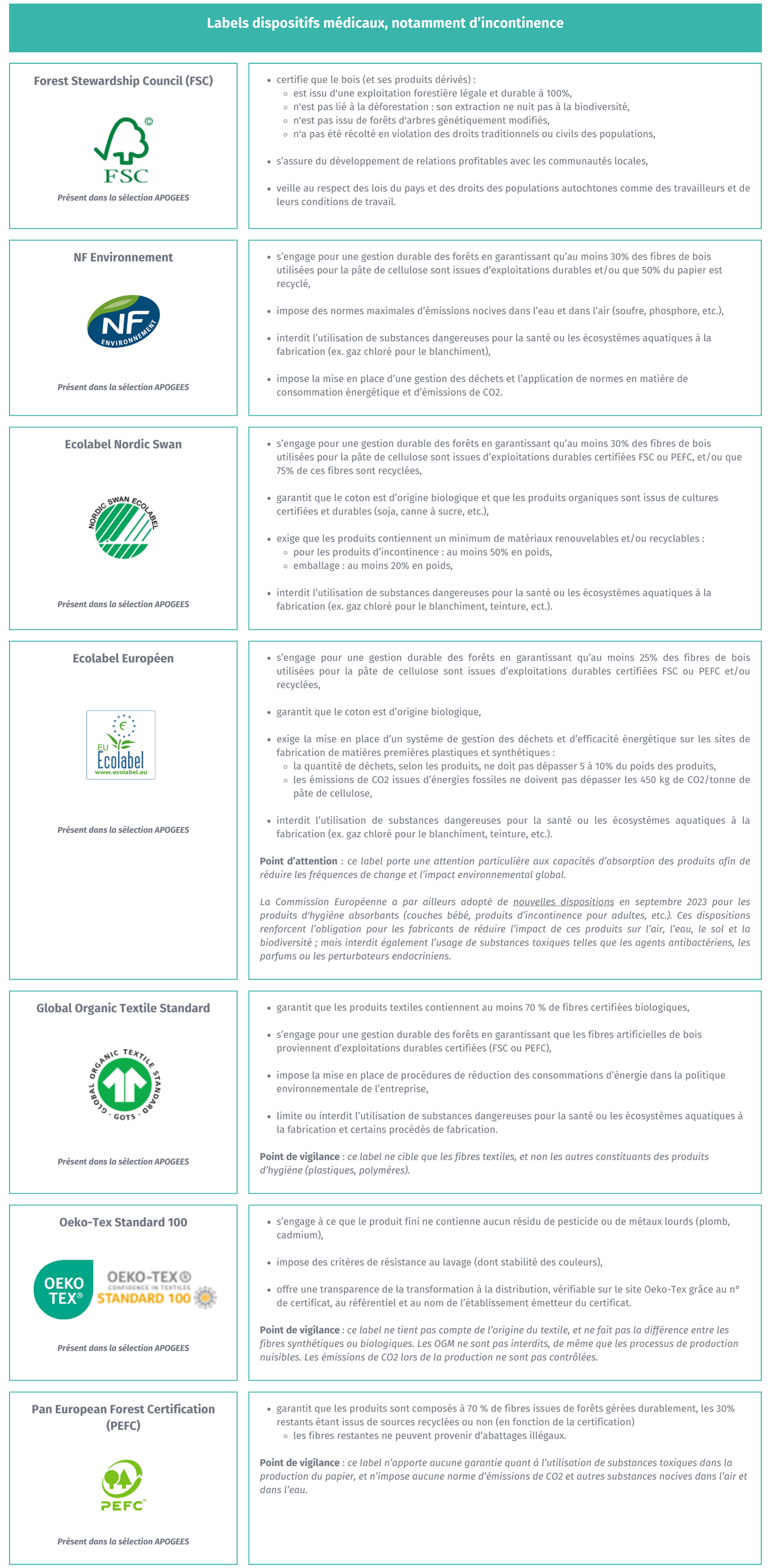 Les postes « Hygiène et soin du corps » et « Dispositifs médicaux - Incontinence » sont d’ailleurs souvent considérés comme prioritaires, et font l’objet de plusieurs dizaines de labels et/ou de démarches durables s’engageant sur leurs propres critères.