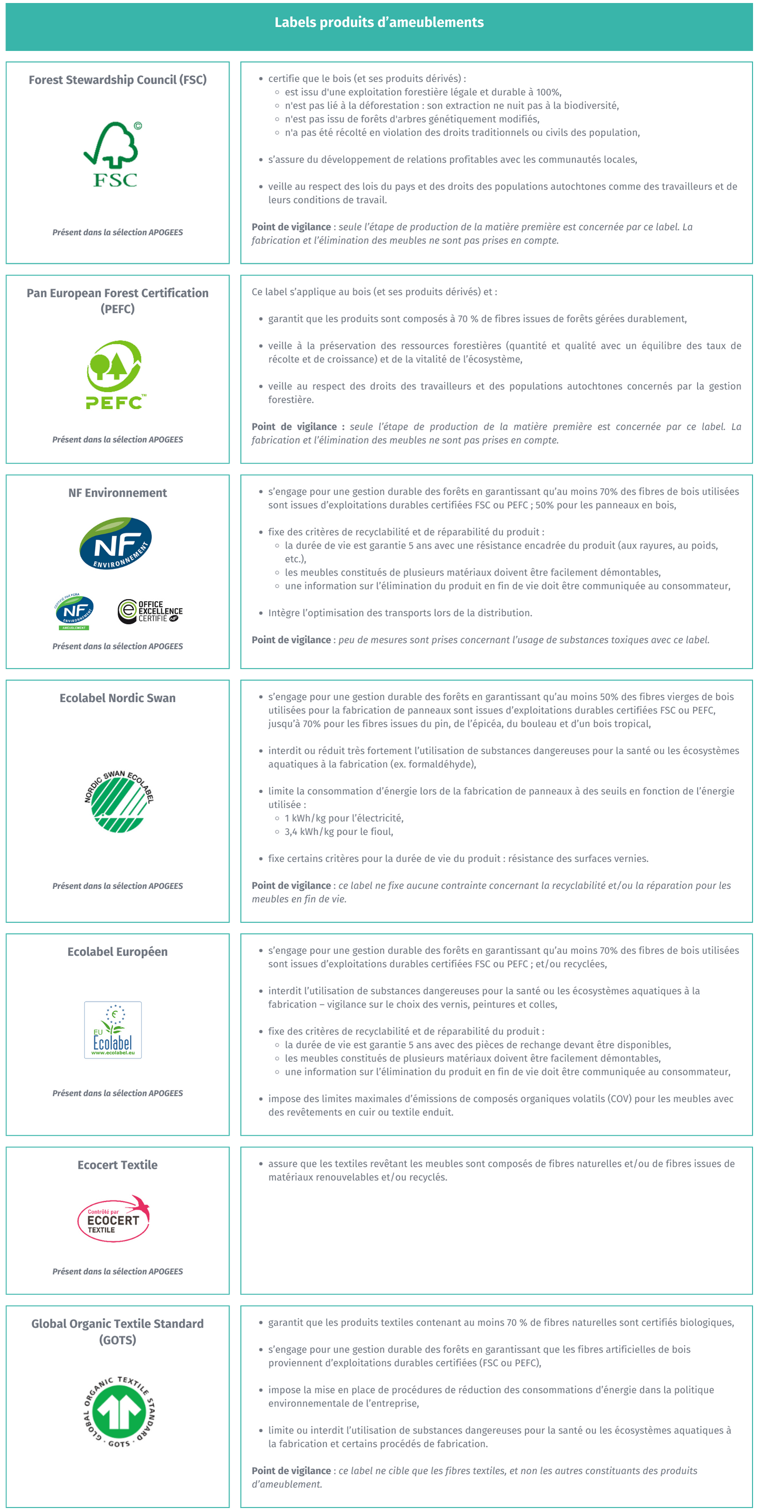 Plusieurs dizaines de labels environnementaux existent pour assurer les consommateurs des caractéristiques écologiques de certains produits d’ameublement moins impactants pour l’environnement. Ces labels garantissent également que ces meubles possèdent une qualité d’usage et une aptitude à l’emploi au moins équivalente à celle d’autres meubles d’usage similaire.