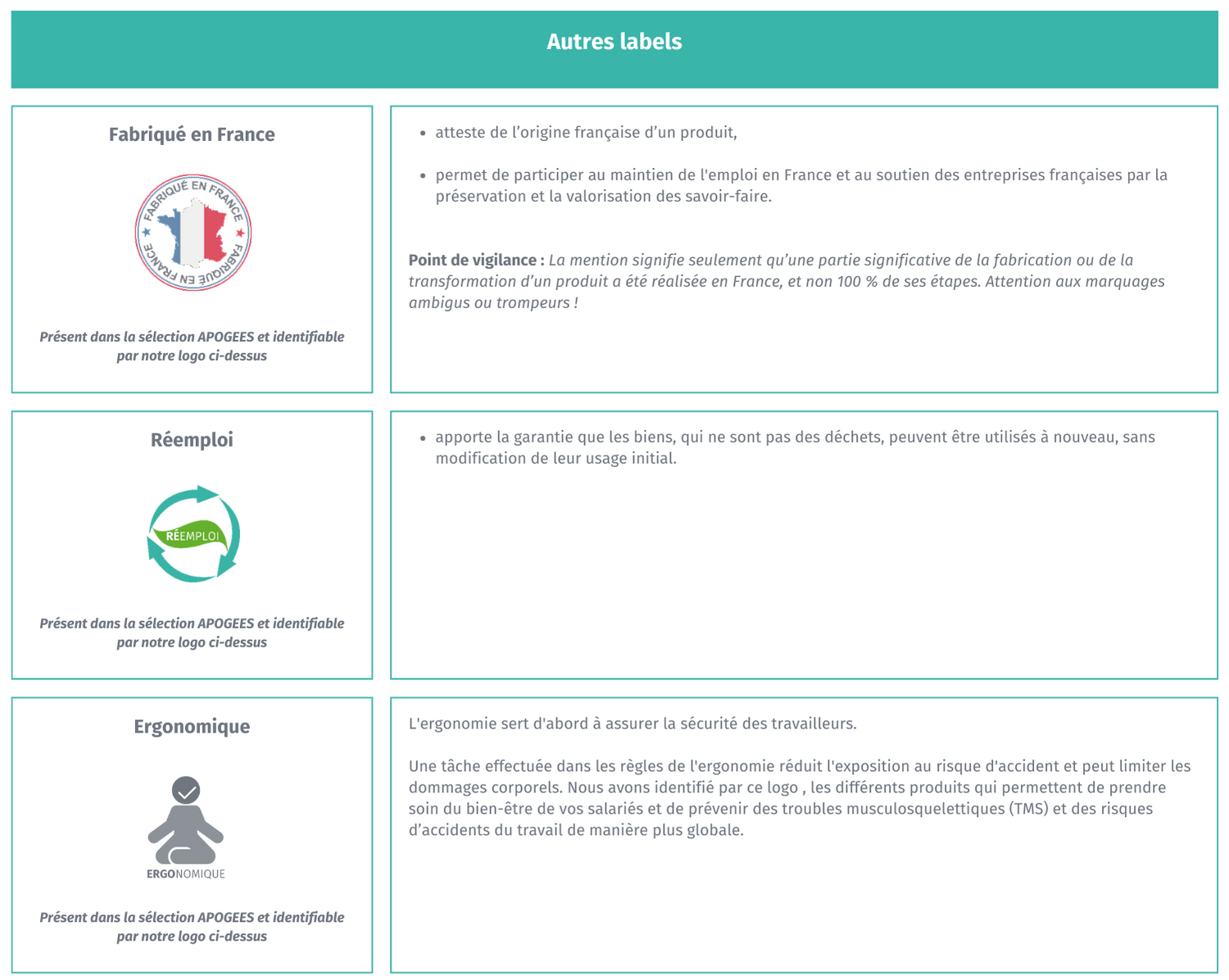 Les experts du Réseau APOGÉES vous recommandent les labels suivants. Certains sont disponibles dans la sélection de produits à votre disposition.