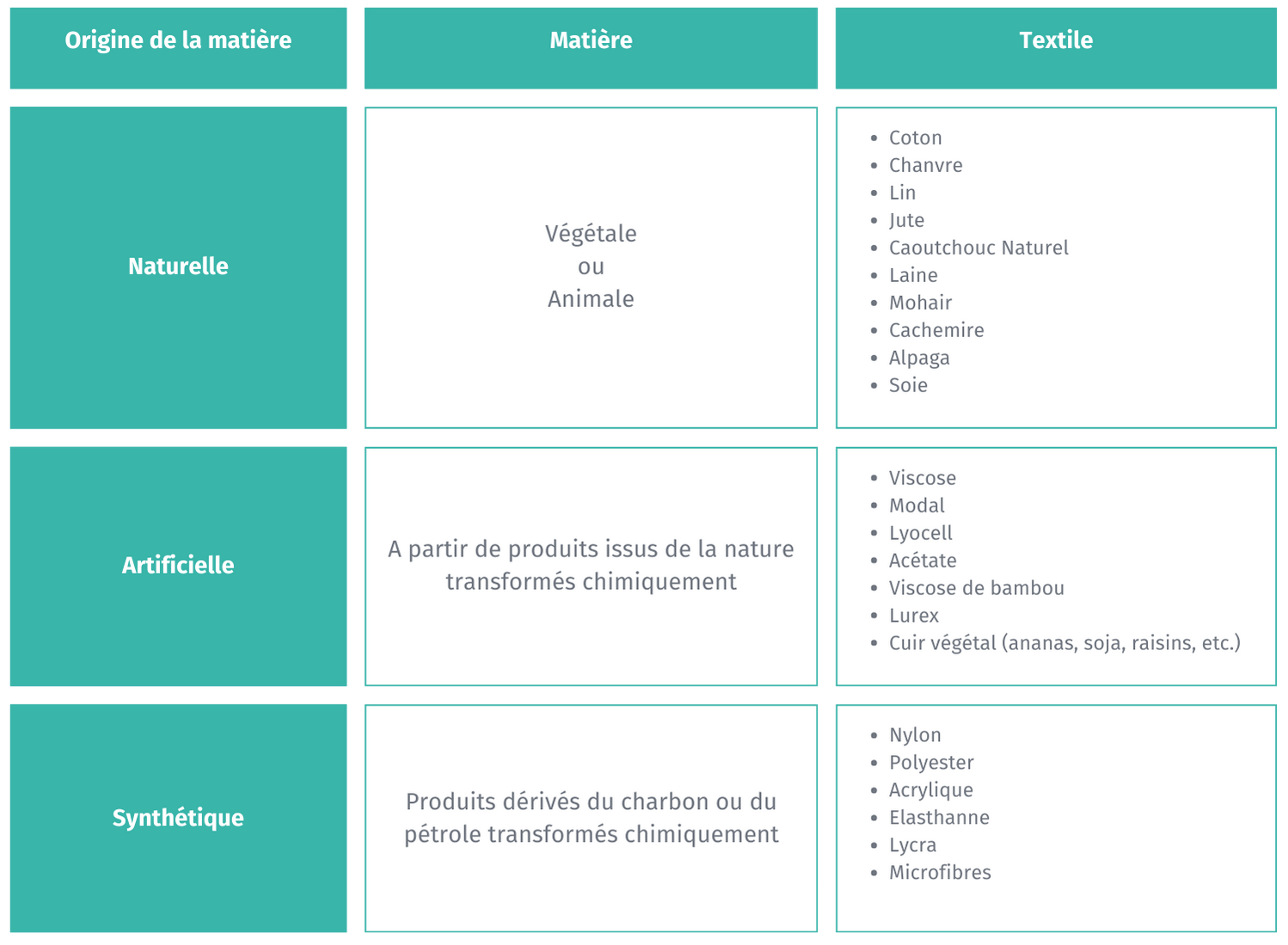 Pour bien comprendre l’industrie textile, il est important de faire la différence entre les 3 différents types de matières premières dont sont issus les tissus :